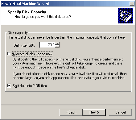 opposed to the default of 2GB. And I will not allow VMware to create the space now. The obvious