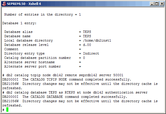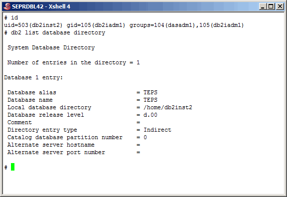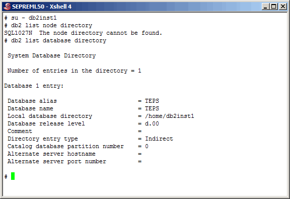 Back on the TEPS, switch to the "db2inst1" user and list out the currnet node and database