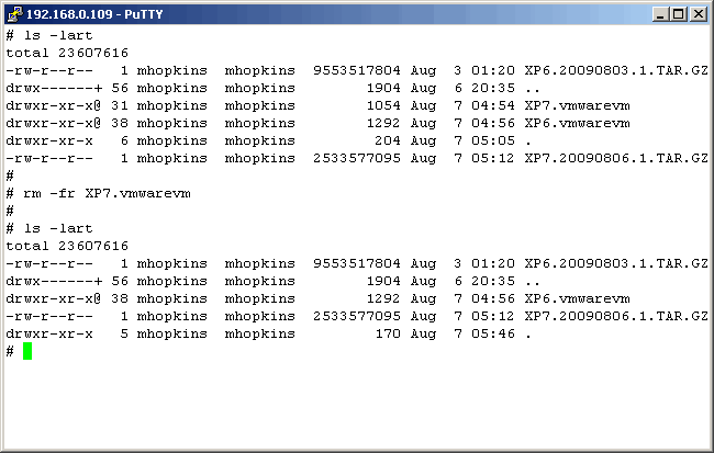 VMwase Fusion, delete the VM using the UNIX "rm" command, as shown here. After the delete, notice